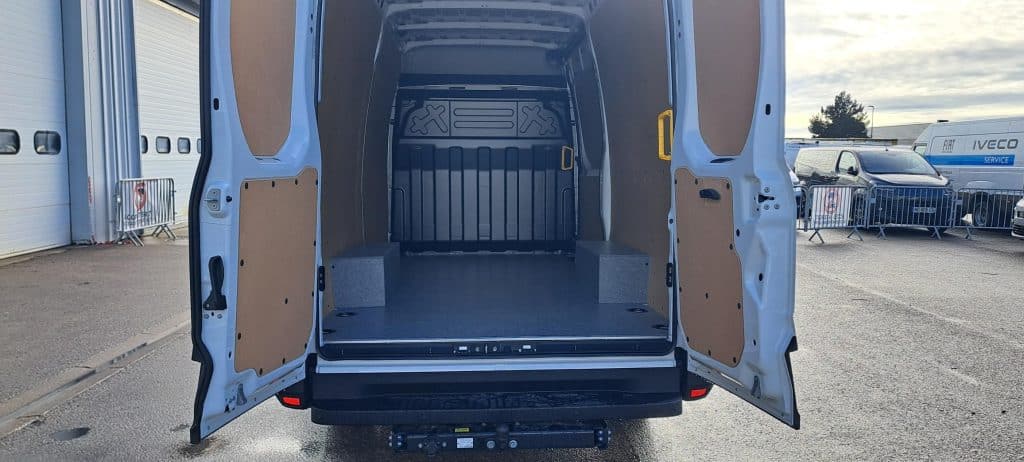 Boîte Mécanicien 6 rapports • Kit bois • Volume de chargement : 12 m3 ( V12 ) • • Roues simples arrière • Verrouillage centralisé • Vitres avant électriques • • Radio avec commande au volant • Bluetooth : kit téléphone "Mains libres" • • Climatisation manuelle • Régulateur et Limiteur de vitesse • • 2 Portes arrière symétriques à ouverture 180 degrés • 1 Porte latérale coulissante à droite •